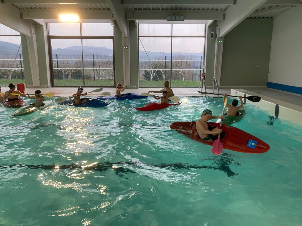 C’est au tour des primaire d’apprendre doucement, mais surement, l’esquimautage en piscine. Le but de la technique est de savoir remettre son bateau à l’endroit s’il venait à se retourner.